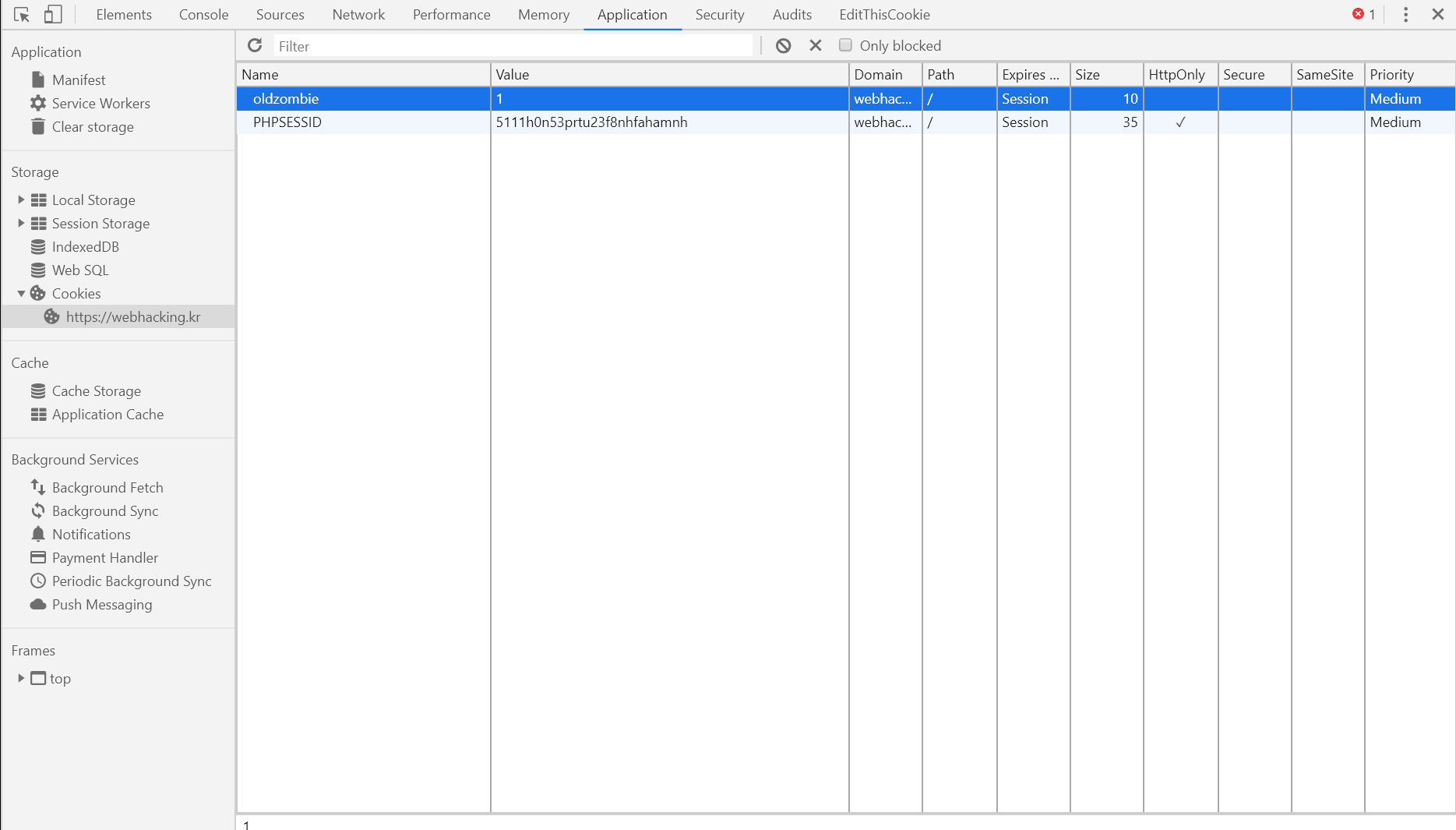 크롬 개발자 도구 > [Application] > [Storage] > [Cookies] > https://webhacking.kr을 통해 oldzombie라는 쿠키값을 만들어 줍니다.