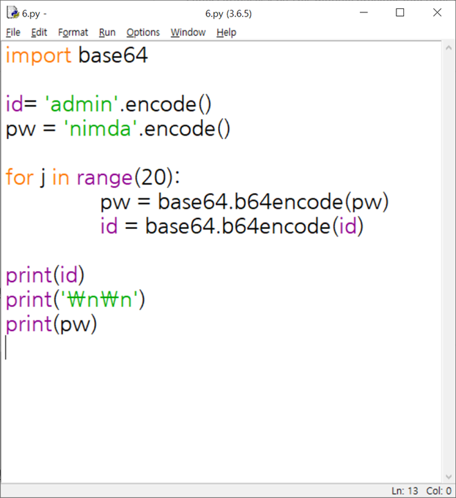 5번째 줄에서 for문을 통해 id와 pw를 base64인코딩으로 각각 20번 암호화하고,