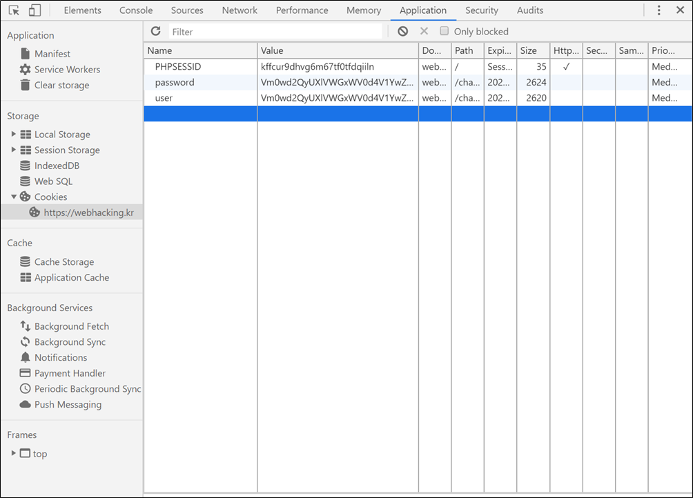 크롬 브라우저에서 [F12] > [Application] > [Storage] > [Cookies] > https://webhacking.kr 에서 user와 password 쿠키값을 더블클릭한 후 바꿔주도록 합시다.