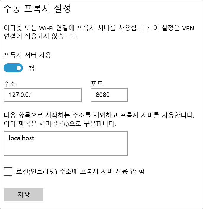 수동 프록시 설정에서 다음과 같이 설정한 후 저장을 눌러줍니다.