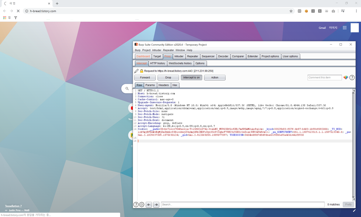한번 제 블로그에 접속할 때 인터셉트를 해보도록 하겠습니다.