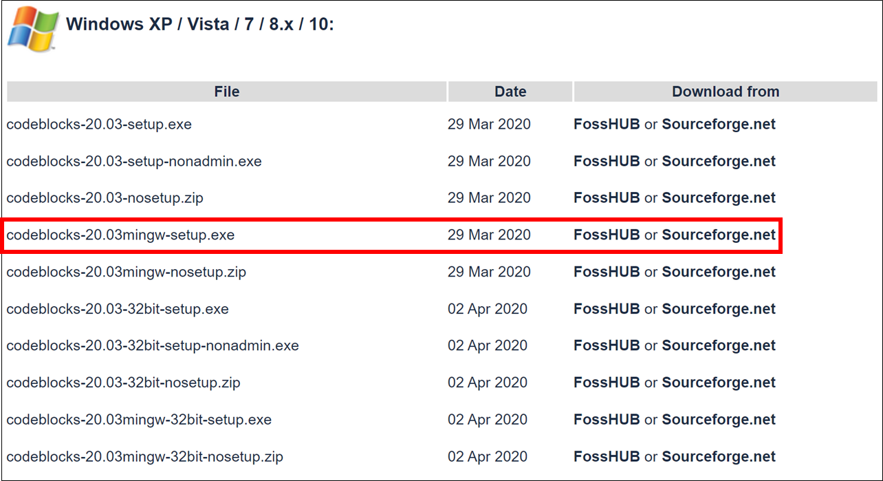 Windows 운영체제를 기준으로 설명드리면, 저는 codeblocks-20.03mingw-setup.exe를 다운받겠습니다.