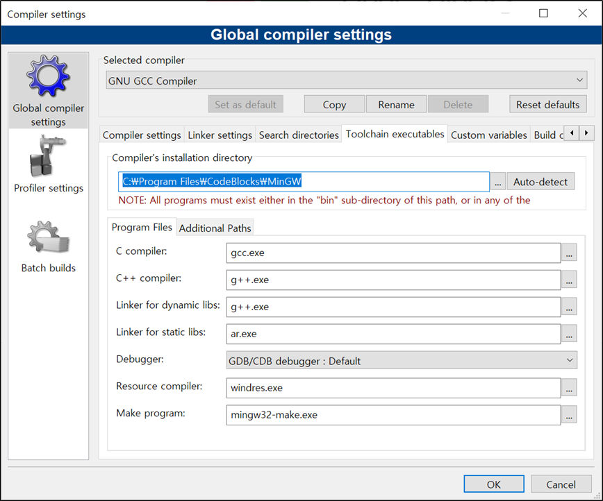 그리고 중간의 [Tollchain executables] 탭을 눌러 Compiler's installation directory의 우측에 있는 Auto-detect를 눌러줍니다.
